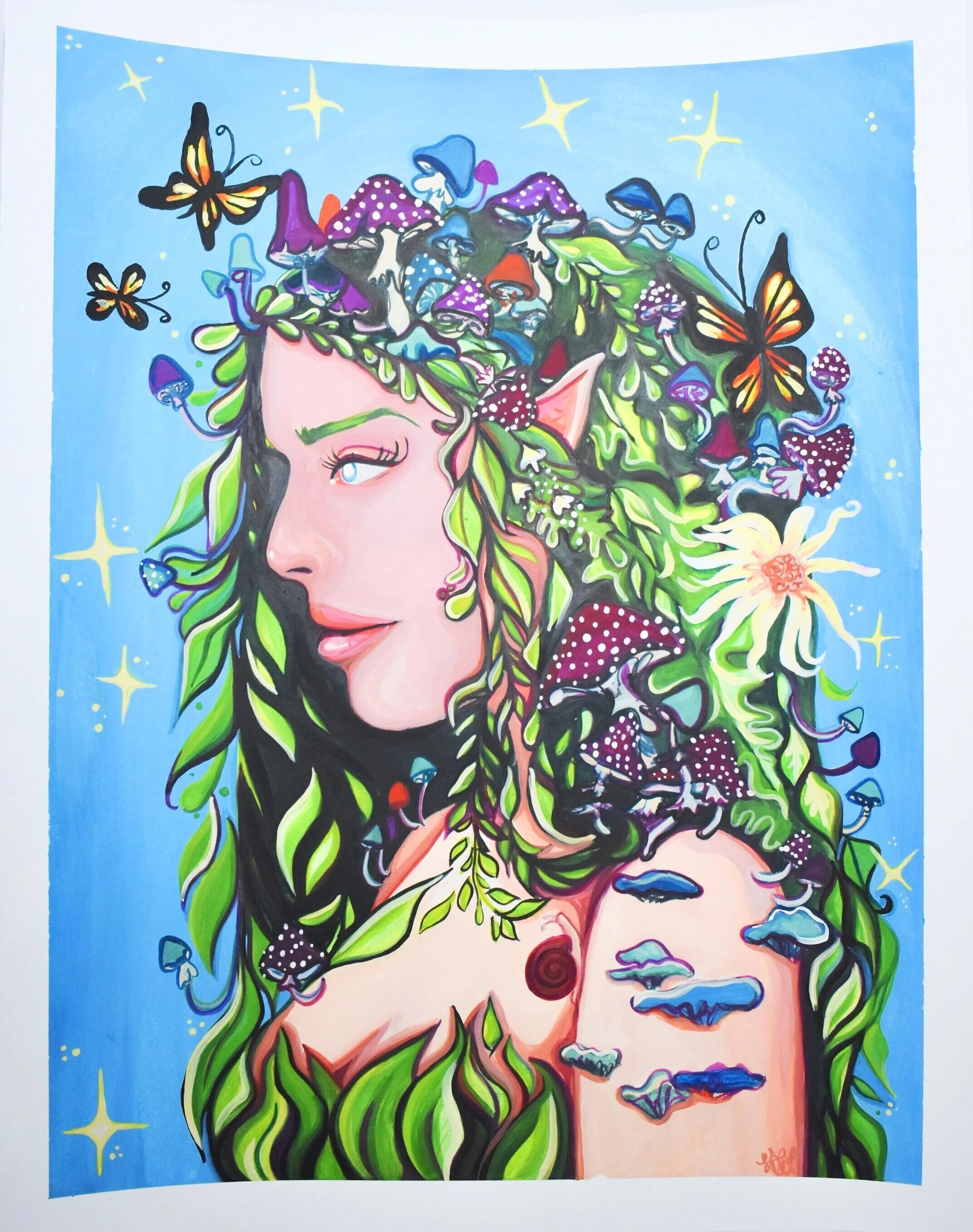 "Forest Nymph" is an original gouache painting on 11” X 14” Mixed Media paper with 1/2 “ distressed borders.